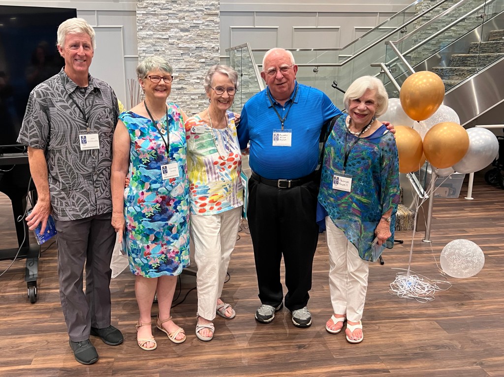 Charlotte Writers Club Award Winners (June 7, 2024): John McGillicuddy (left) and Carolina Kane Kenna were honored with the 2024 Aline Thompson Award for service to the CWC; the three 2024 recipients of the A.L. Kimball Founder’s Award, honoring distinguished service to the club and literary community, were Mary Kratt, historian and poet; Richard Allen Taylor, past president, and Dannye Romine Powell, poet and journalist.